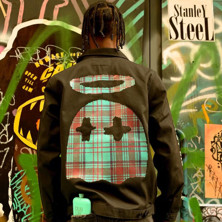 The B Wood x Dubliner Drinking jacket uses an upcycled, work jacket silhouette that features a crest-style logo that blends the Dubliner Irish Whiskey logo and Wood’s own family crest on the front. The signature plaid of the City of Dublin is incorporated into B Wood’s signature “ghost” design on the back. The jacket sleeve is emblazoned with the “Live Gooney Die Saint” expression that’s featured on many of B Wood’s designs.