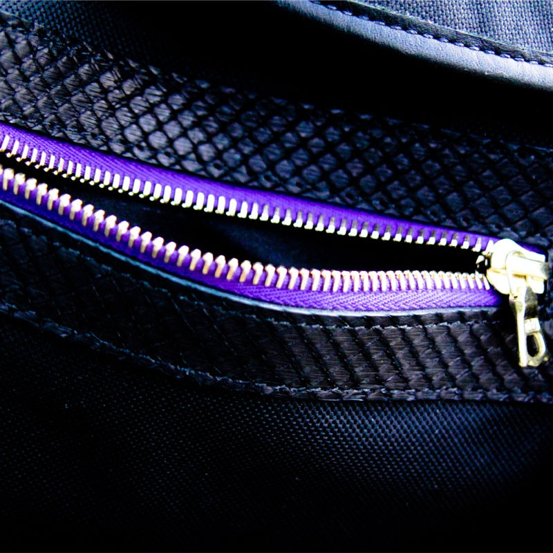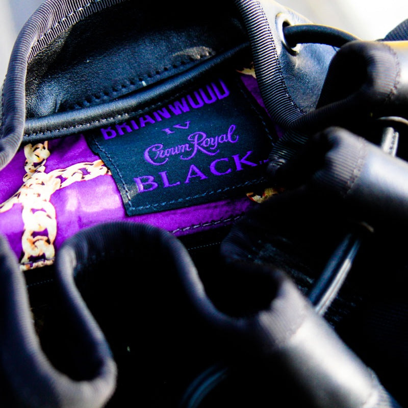 The weekend traveler bag was made in NewYork and designed by Brian Wood. The overnight duffle, made of a water repellant blend bonded neoprene imported from Italy with herringbone twill straps, features a flap pocket with magnetic snaps, and includes 100% purple silk lining with gold chain print, echoing the design of the Crown Royal purple bag and gold rope. After success with The Weekend Traveler, Crown Royal invited Brian to design The Crown Backpack.